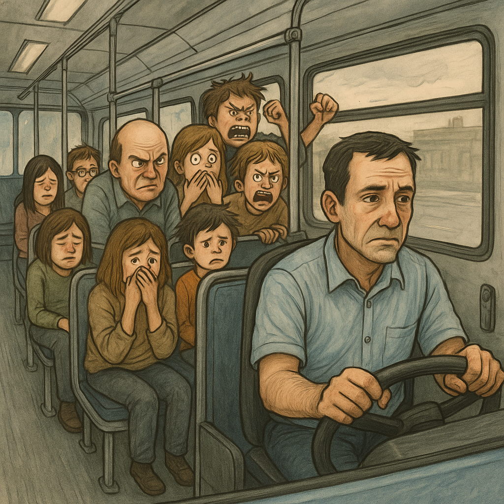 You have driven the same route 24/7 for your entire career, and in this fantasy land, you have very consistent mix of passengers who board and deboard at different stops. They are different ages, genders, etc. They tend to not age, despite riding for 42 years on the same route. They all have pretty predictable personalities and behaviors. They all respond in very unique and consistent ways to certain events and situations. Some passengers are scary, taunt you, threaten you, and even hijack the bus at times. These passengers, if left unchecked, will gang up and overthrow the bus. This is a low-barrier transit system, so despite their terrible behavior, they can continue to ride the bus, forever, until you retire. Expected retirement age in this fantasy land is 75 years old. So you have 32 more years of these passengers on your bus.