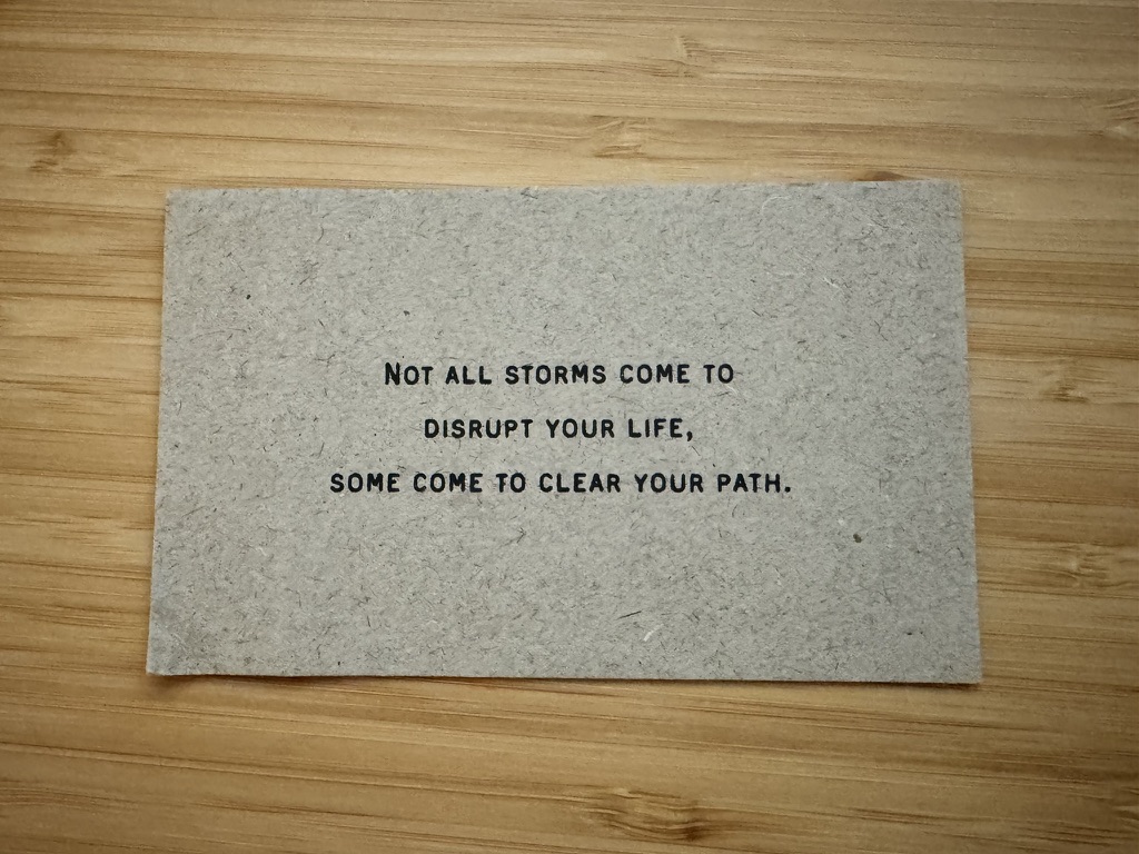 The first is The Pivot Year by Brianna Wiest. That book came to me in a way I still think about. A few years ago I found these little cards in a shop with quotes on them. Bought ten of them. Gave most of them away when the timing felt right. Was down to my last one. It says not all storms come to disrupt your life, some come to clear your path. I cannot tell you how many times that has been exactly right.