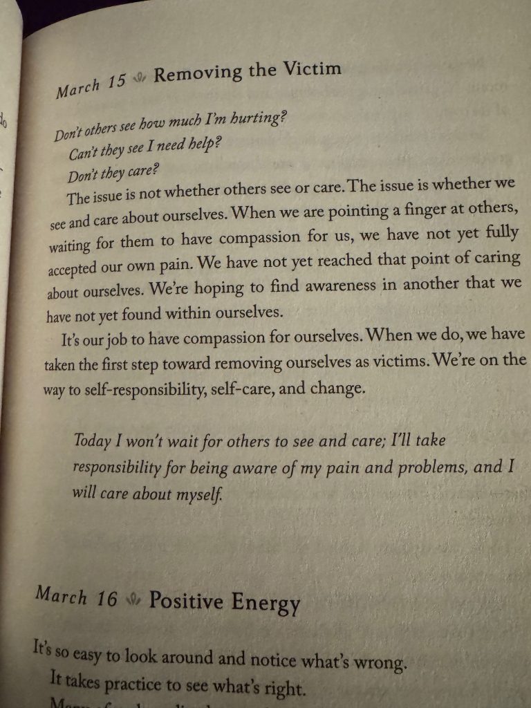 The second meditation is about codependency recovery in the book The Language of Letting Go by Melanie Beattie. The patterns. How we lose ourselves in other people. How we choose differently when we finally understand what we have been doing and why.